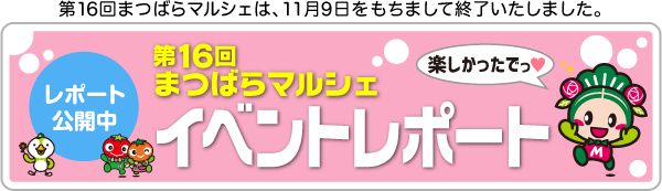 - 第16回まつばらマルシェ開催終了いたしました。お蔭様で2日間合計50,360名のお客様にご来場いただきました。誠に有り難うございました!